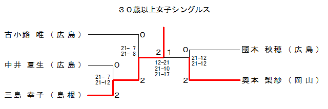 | 30WS-3 | 岡山 | 奥本 梨紗 | 2 | 21-12 21-12 | 0 | 國本 秋穂 | 広島 | |