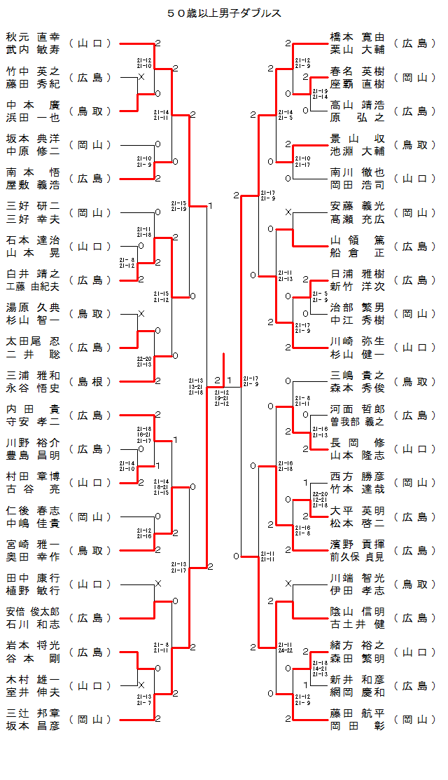 | 50MD-11 | 山口 | 秋元 直幸・武内 敏寿 | 2 | 21-12 21-10 | 0 | 中本 廣・浜田 一也 | 鳥取 | |