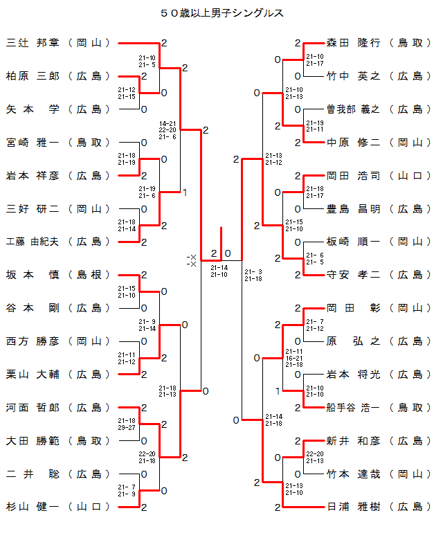 | 50MS-19 | 岡山 | 中原 修二 | 2 | 21-10 21-13 | 0 | 森田 隆行 | 鳥取 | |