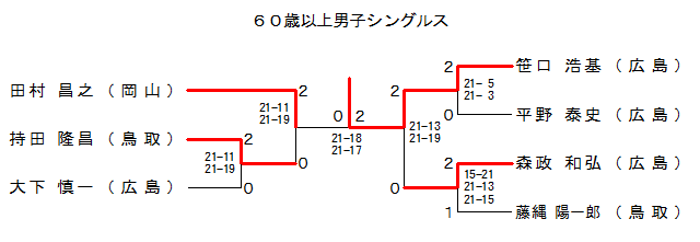 | 60MS-1 | 鳥取 | 持田 隆昌 | 2 | 21-11 21-19 | 0 | 大下 慎一 | 広島 | |