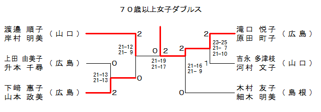 | 70WD-3 | 山口 | 渡邉 順子・岸村 明美 | 2 | 21-12 21- 9 | 0 | 下ア 惠子・山本 政美 | 広島 | |